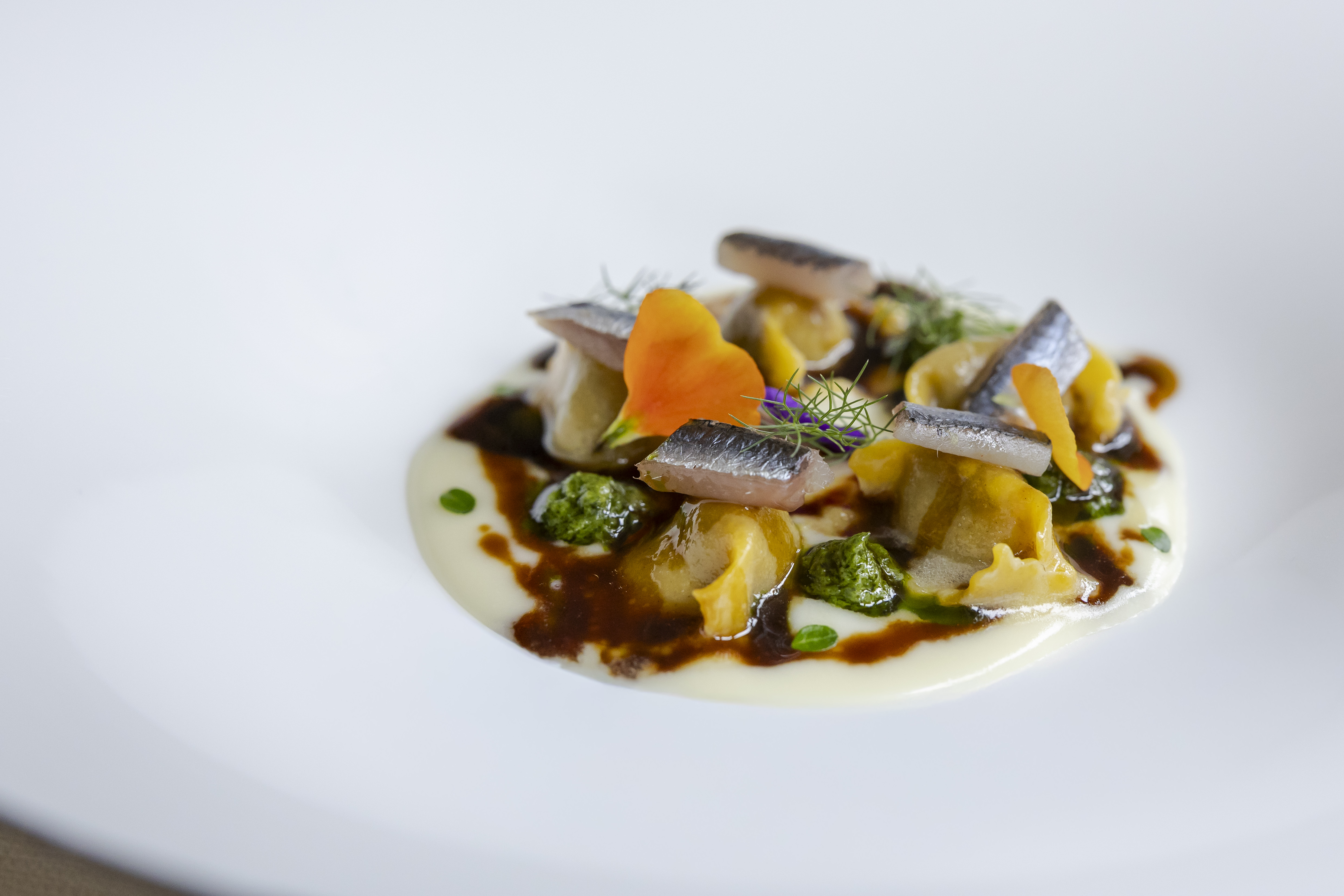 Agnolotti del plin ripieni di manzo, alici, salsa verde e fonduta di Fior di Capalbio